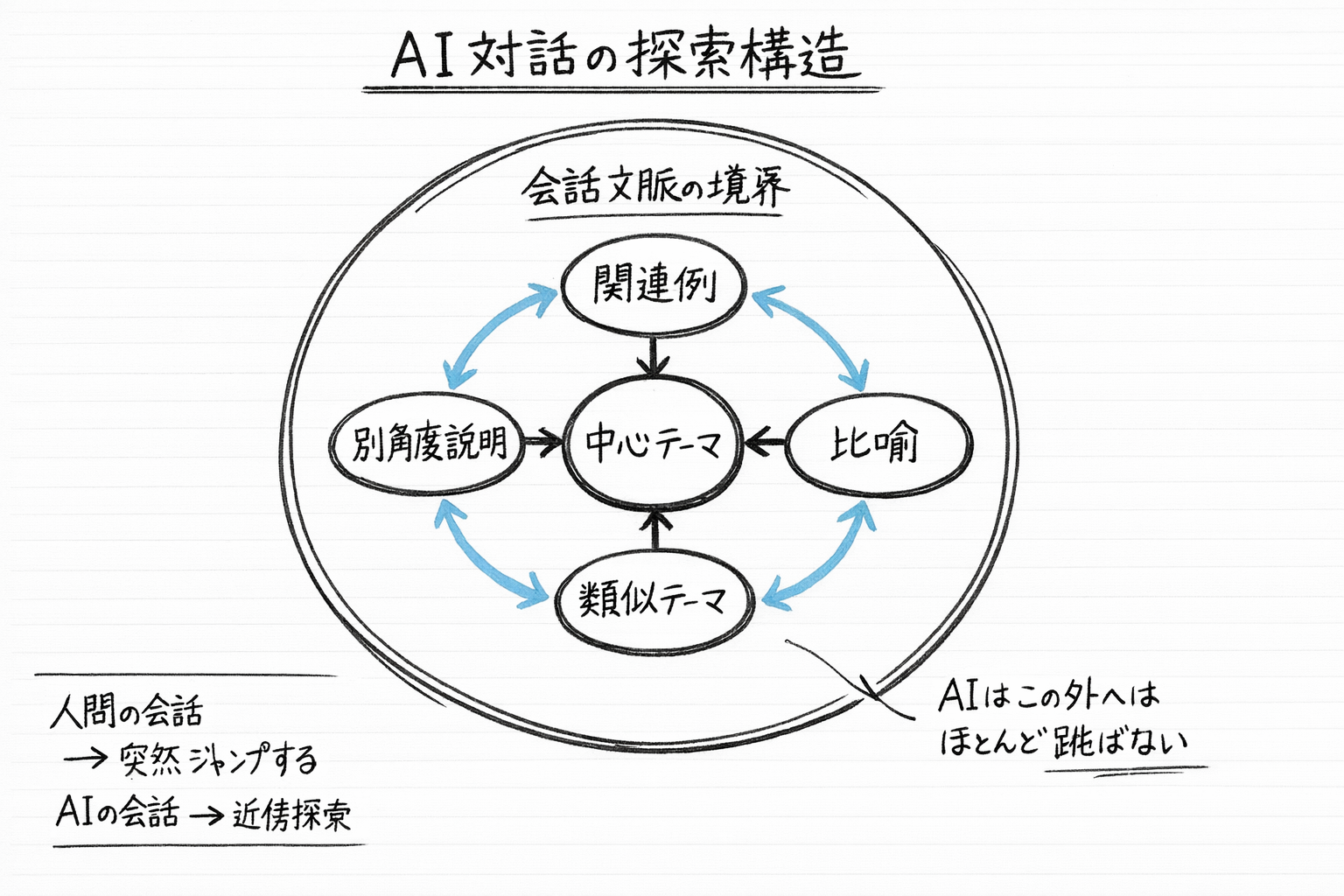 人間の会話では「急に別の話を思い出す」「そういえば全然違う話だけど」という飛躍がよく起きる。AIは基本的にそれをほとんどしない。会話の近傍をなめるように進む。