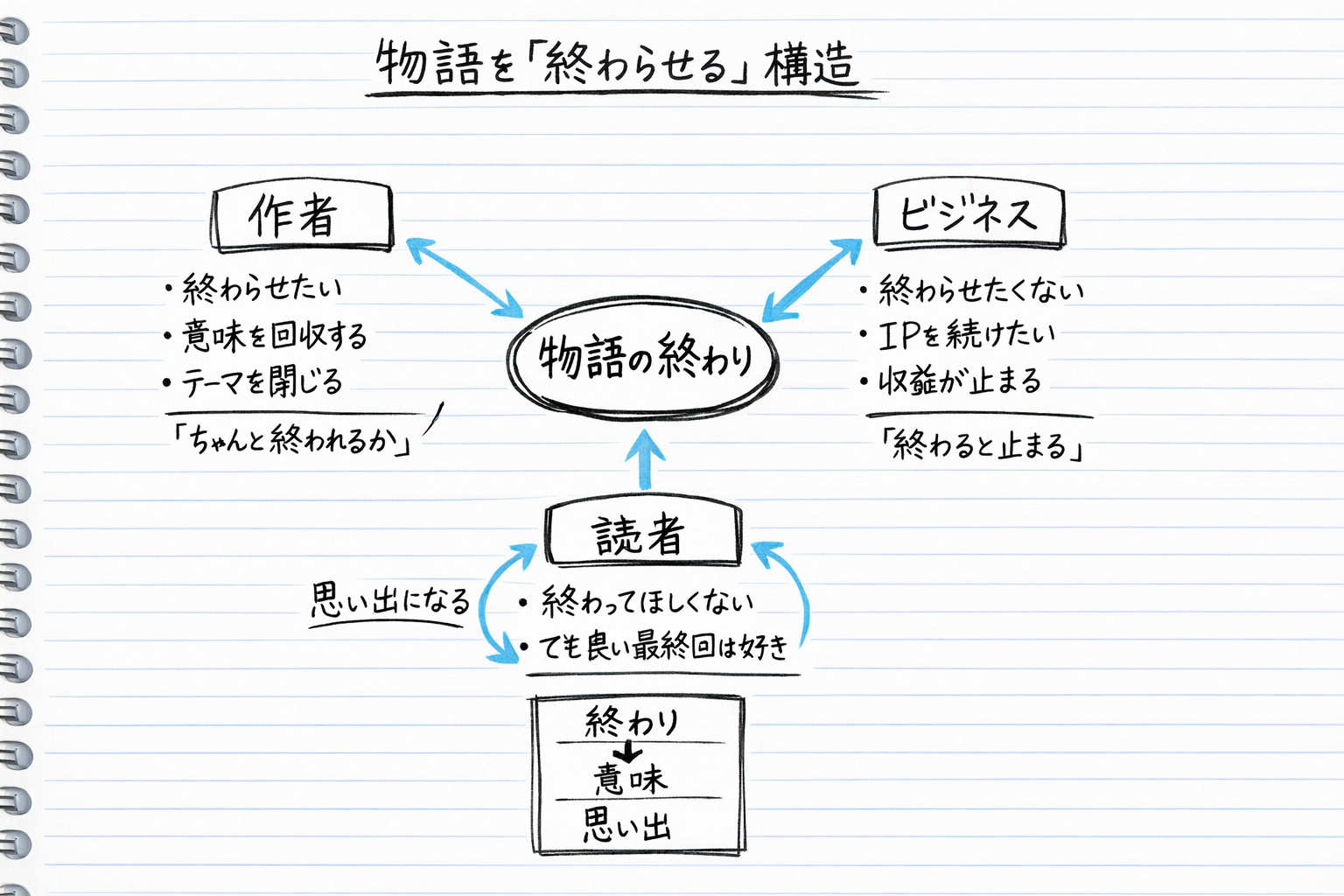 完結した物語は時間の箱になる。鋼の錬金術師の最終話、進撃の巨人の終幕——あの瞬間に何かが「閉じた」感覚があったはずだ。その感覚は、終わりがあって初めて生まれる。