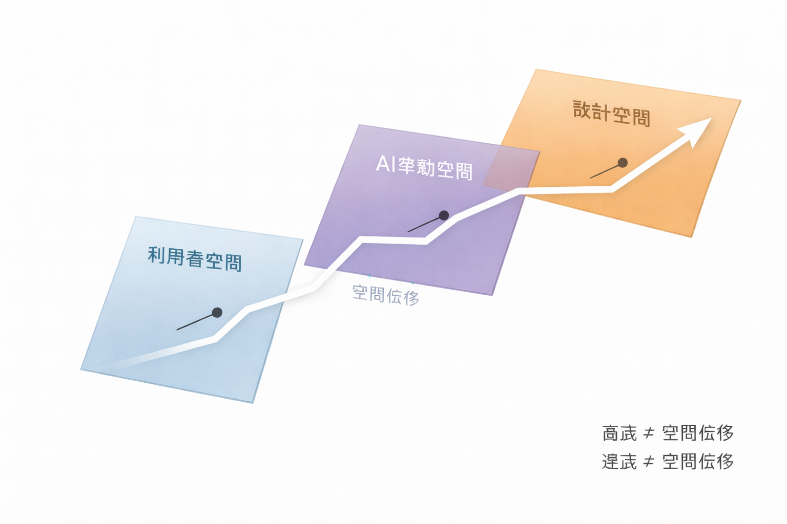「自分を俯瞰する」ではなく、利用者空間・実装空間・設計空間といった、意味の異なる空間そのものを飛び越える動きだ。