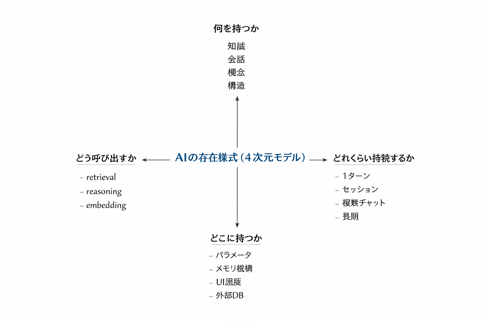 | AI | ① 何を持つか | ② どれくらい持続するか | ③ どこに持つか | ④ どう呼び出すか |