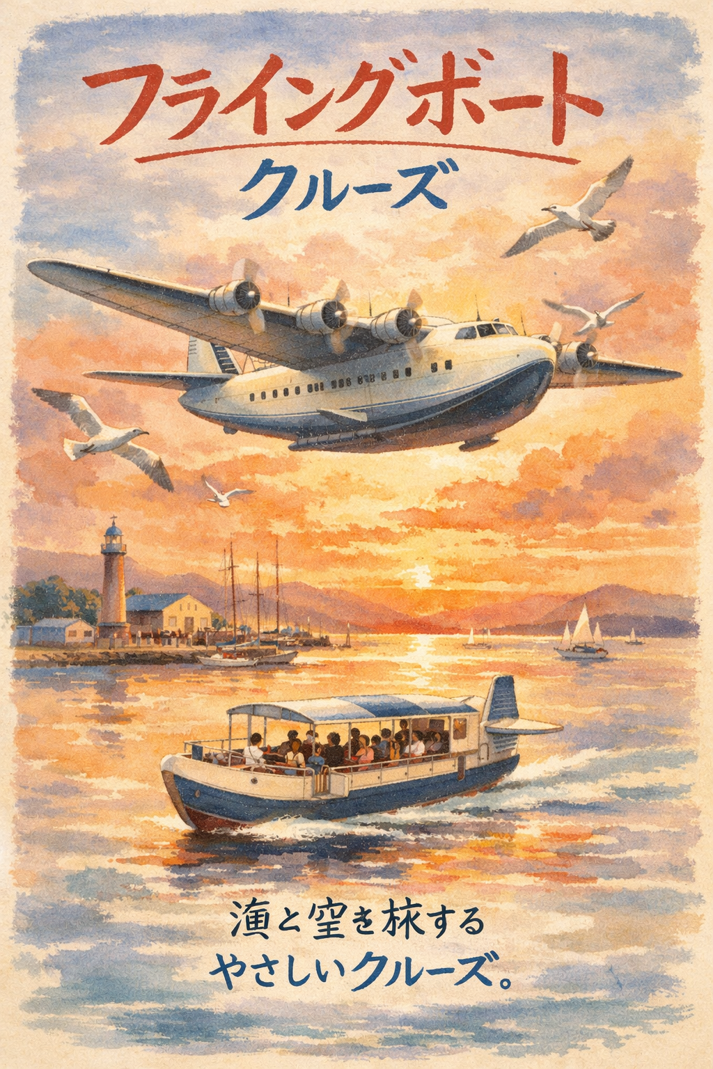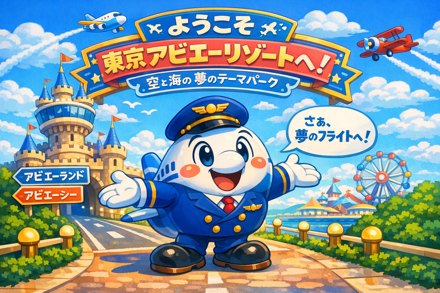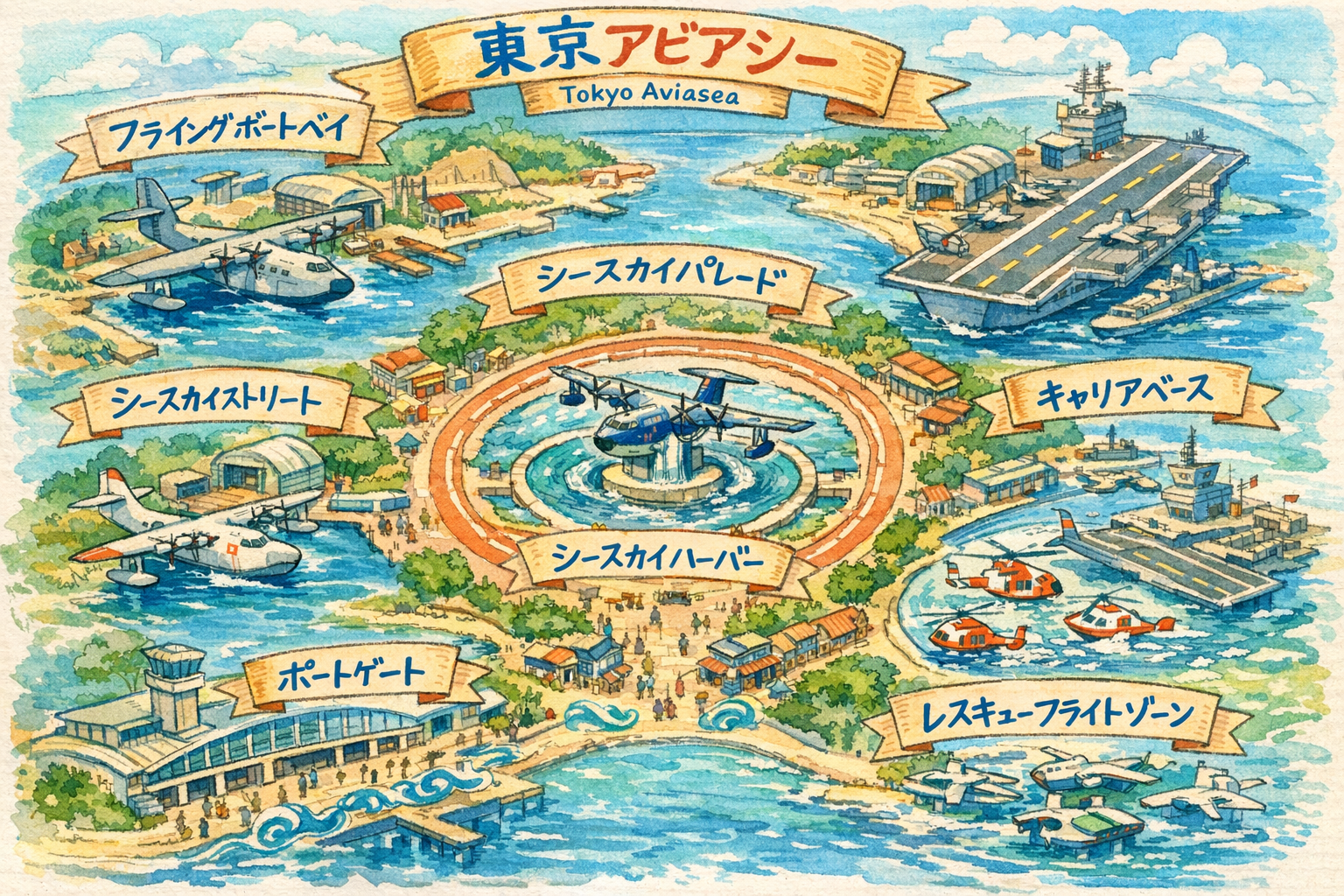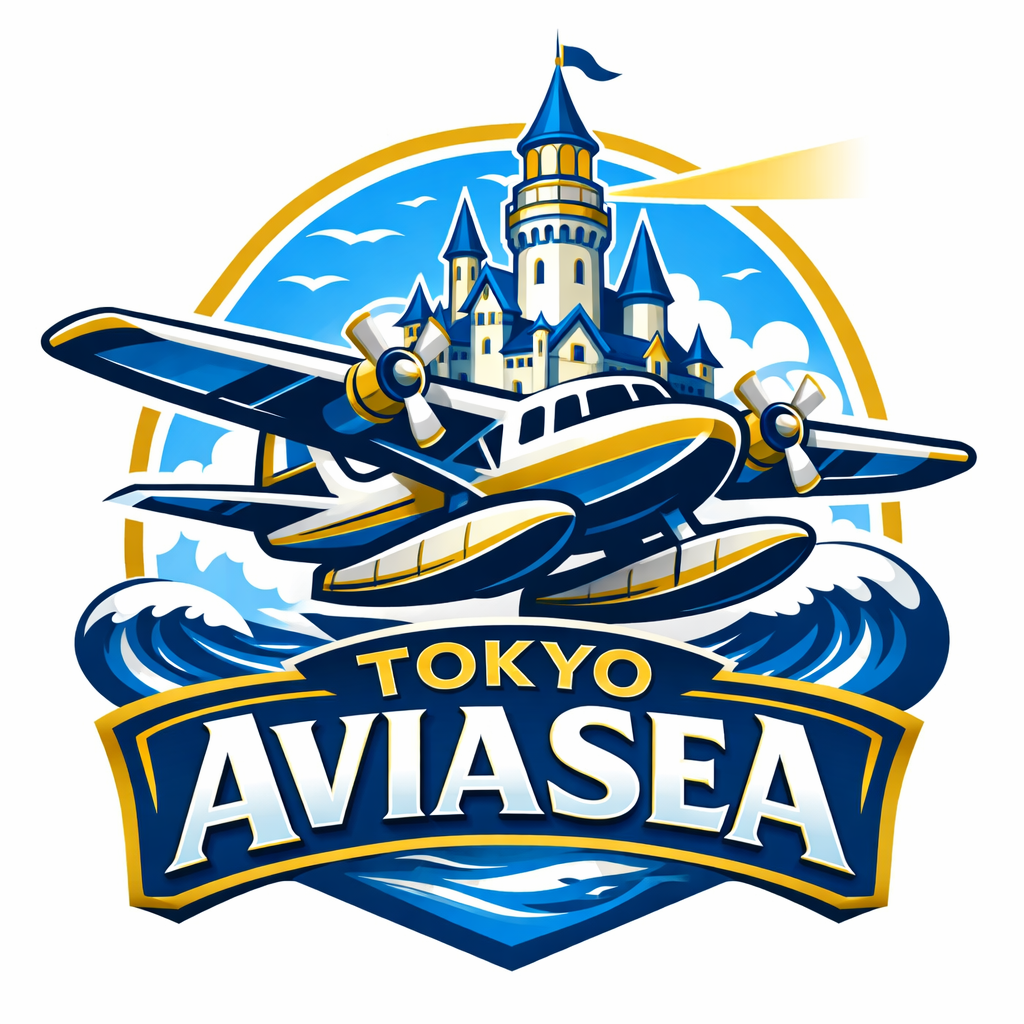 青い海と白い波を背景に、航空機が海上から飛び立つ姿が描かれ、背後には灯台型のシンボルタワーがそびえます。「Tokyo Aviasea」という名前は、aviation(航空)とsea(海)を組み合わせた造語。ここは、空と海の夢が交わる特別な場所です。