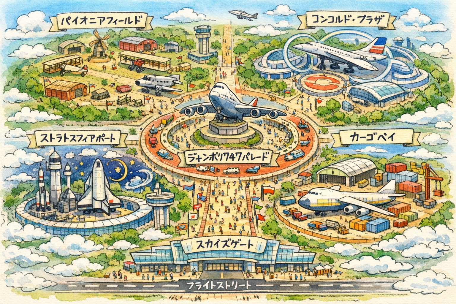 ゲストの皆さまは、空港ターミナルをイメージした入口から足を踏み入れ、中央のハブ広場「ジャンボ・エアポート」を起点に、各エリアへの冒険へと旅立ちます。実際の航空路線ネットワークと同じハブアンドスポーク構造を模したパーク設計により、歩くだけで空港にいる感覚が広がります。あなたの夢の旅が、ここから始まります。