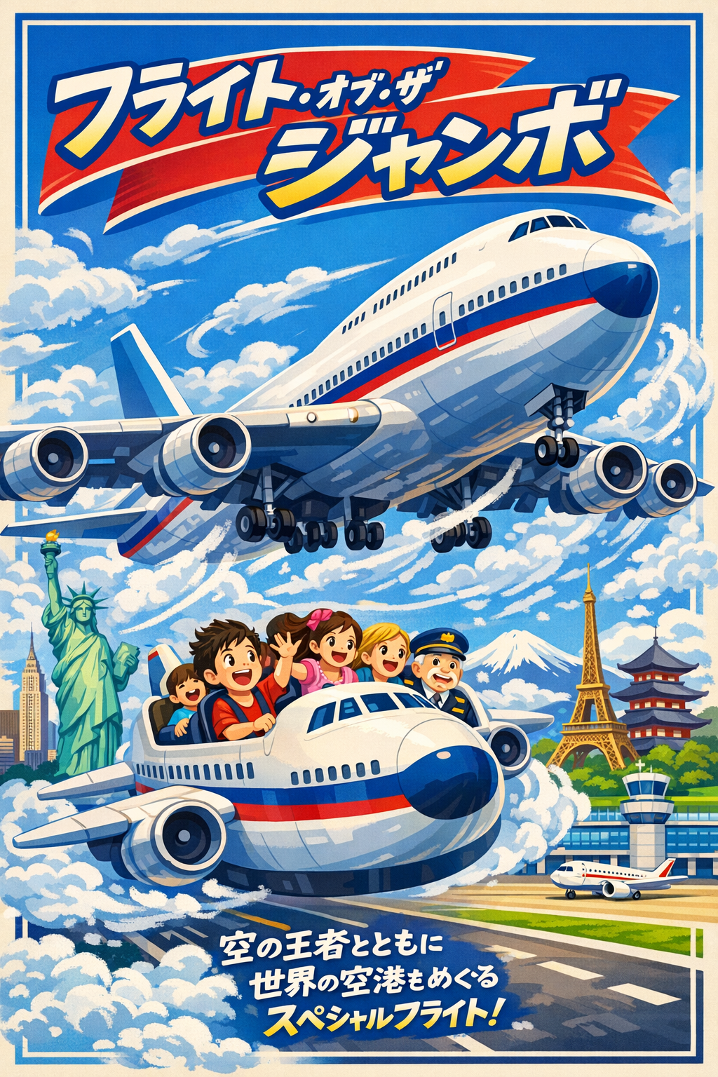 雲の上を飛ぶ747の背後には、パークのシンボルタワーが堂々とそびえ立ちます。このタワーは「航空の王国」を象徴する特別な存在であり、パーク全体を見守る灯台のような役割を果たしています。