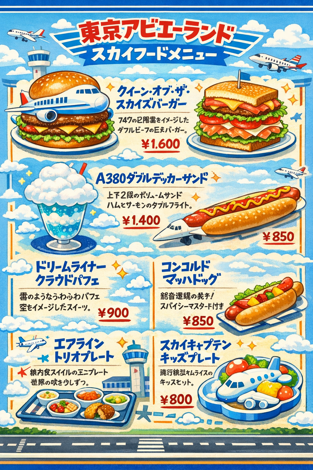 クイーン・オブ・ザ・スカイズバーガー(¥1,600)は、747の二階席構造をイメージした二段構造の巨大バーガーです。A380ダブルデッカーサンド(¥1,400)は、上下二段のボリュームサンドでA380のダブルデッキ構造を美味しく体験できます。コンコルドマッハドッグ(¥850)は、超音速の細長さをホットドッグに変換し、スパイシーマスタードで「速度」を表現した一品。ドリームライナークラウドパフェ(¥900)は、787の静かな美しさをイメージした、雲のようなふわふわのスイーツです。