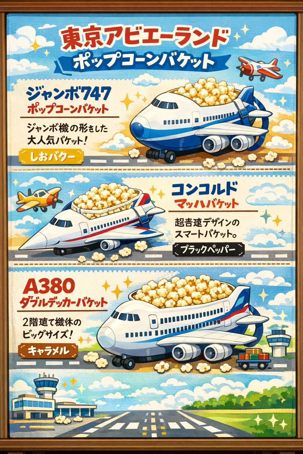 そしてパーク定番の思い出グッズ、ポップコーンバケットは三種類。747型(しおバター)、コンコルド型(ブラックペッパー)、A380型(キャラメル)で、それぞれの機体のキャラクターと味がぴったり対応しています。