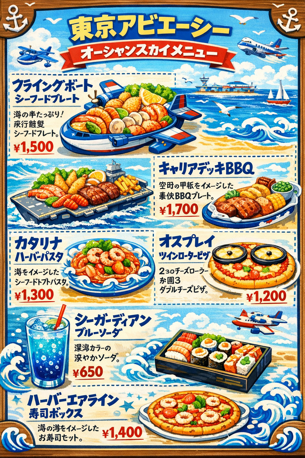 フライングボートシーフードプレート(¥1,500)は、飛行艇型のプレートにエビ、ホタテ、魚料理などが華やかに盛り付けられた一品です。キャリアデッキBBQ(¥1,700)は、空母の甲板をイメージしたプレートで楽しむ、豪快なBBQ料理。アビエーシー最高峰のスペシャルメニューです。カタリナハーバーパスタ(¥1,300)は、レトロな飛行艇の雰囲気にぴったりのシーフードトマトパスタ。オスプレイツインローターピザ(¥1,200)は、オスプレイのローターをチーズで表現したユニークなダブルチーズピザで、見た瞬間に笑顔になれる一品です。