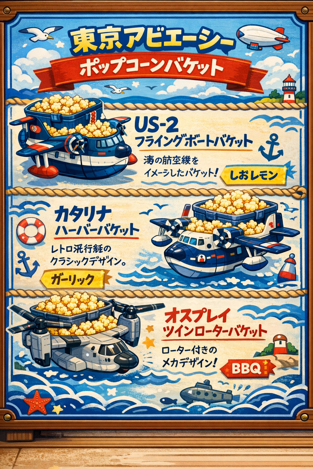 ポップコーンバケットはUS-2型(しおレモン)、カタリナ型(ガーリック)、オスプレイ型(BBQ)の三種。特にオスプレイ型はローター付きのメカデザインで、コレクターズアイテムとしても人気です。