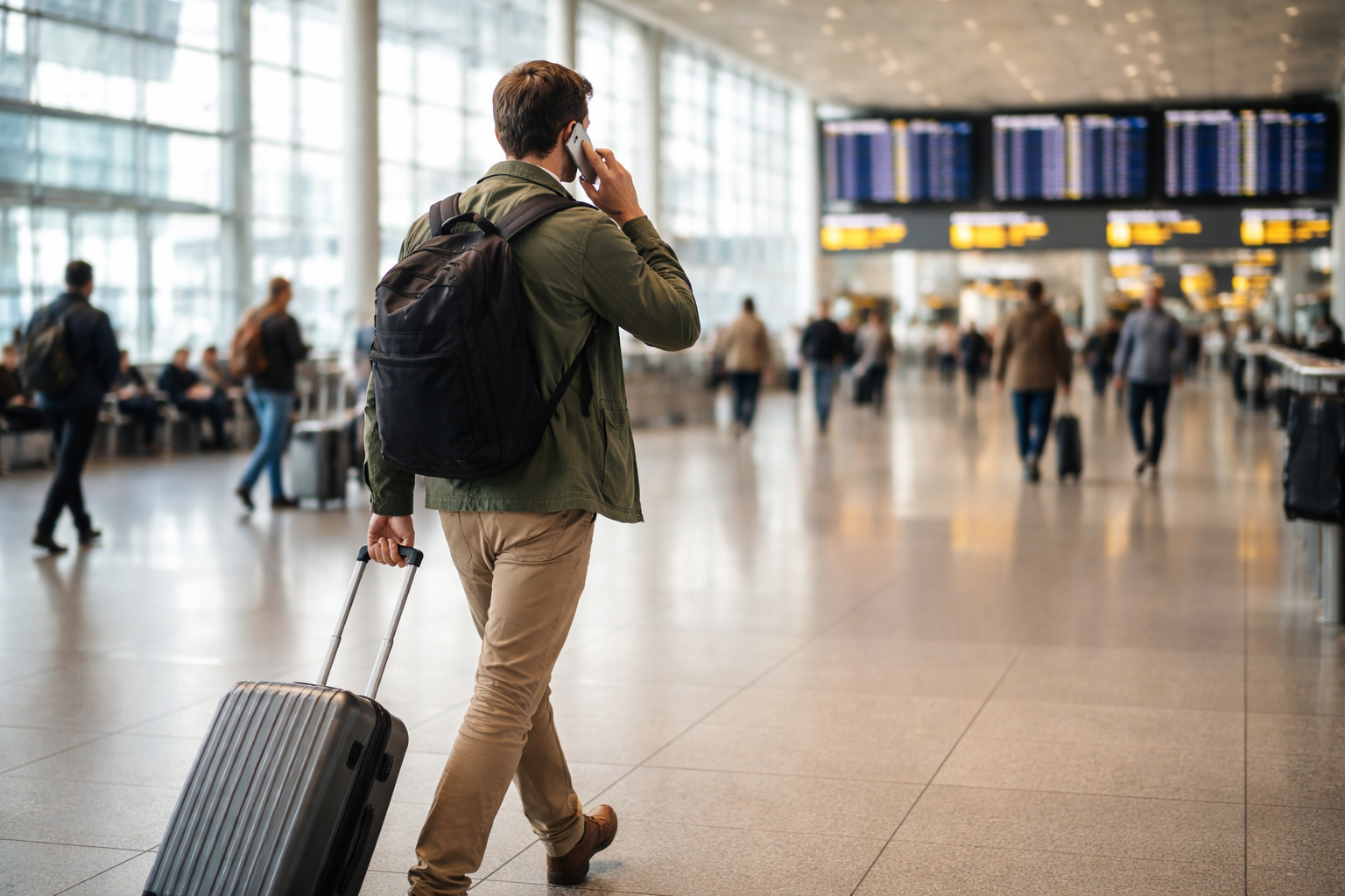 空港のロビーで、誰かがスマートフォンを耳に当てている。
